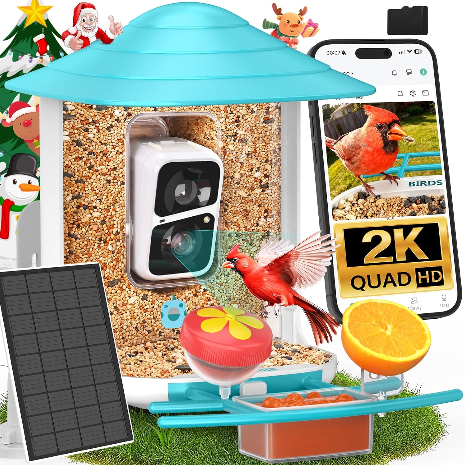 TUC Smart Bird Feeder with Camera 2K HD, Solar Panel 32GB Card 4-in-1 Perch, 160┬░View Auto Detect & Notify AI Identify Video Bird Camera Wireless Outdoors Ideal Gift for Birds Lover |