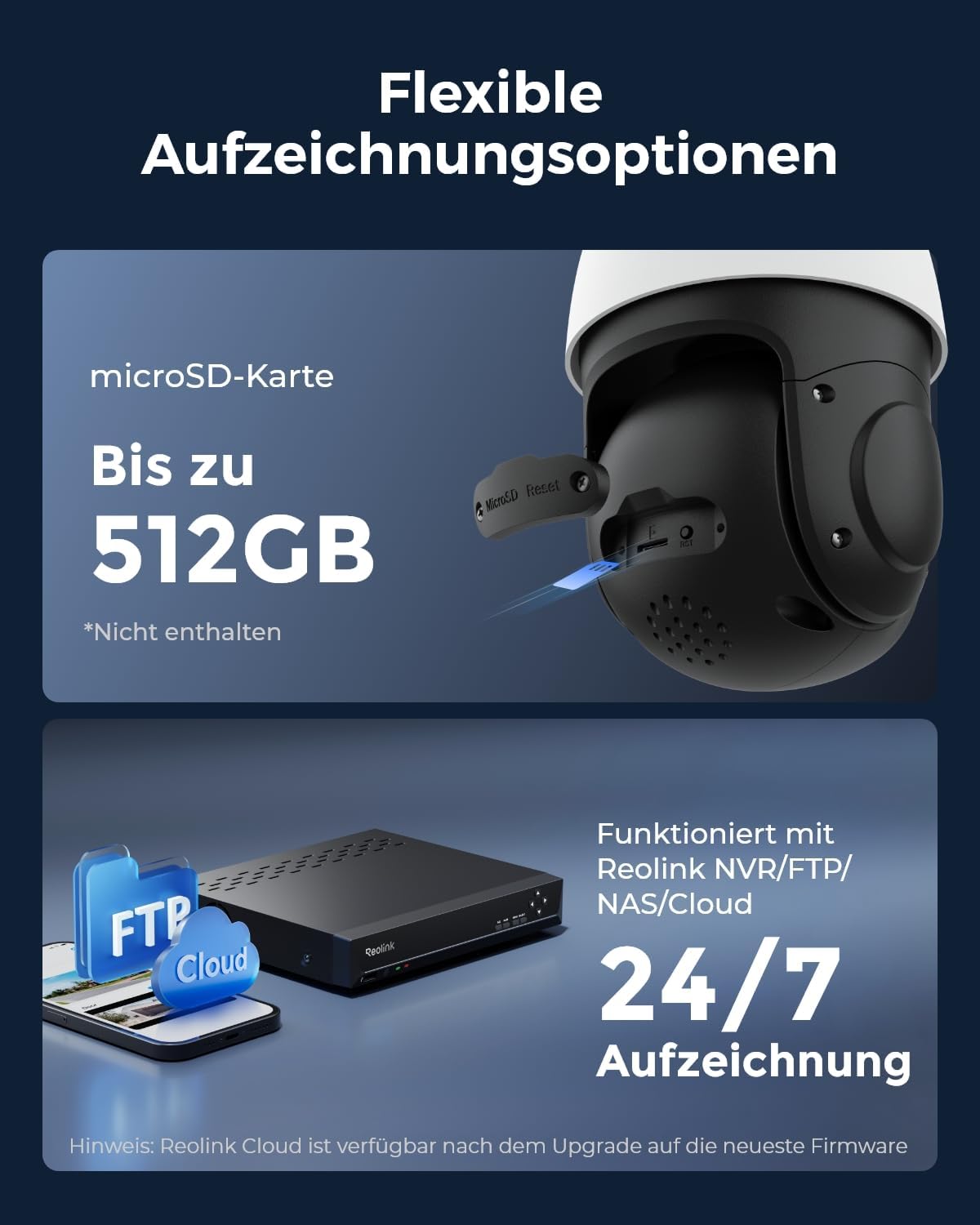 4K UHD VIDEO & TWO NIGHT VIDEO MODES: Enjoy stunning view in 4K 8MP Ultra HD with this camera, color details even in low light conditions. When you switch to infrared night vision mode, you can see clear details even from a distance of up to 60 metres. 360° PAN & 90° TILT & AUTO TRACKING: Enjoy a wide viewing angle with the RLC-823S1. With 360° pan and 90° tilt functions, the camera automatically tracks moving targets from every corner. (Adjustable swivel speed: 1.4°-180°/s; tilt: 1.4°-56°/s). 5x 3D optical zoom function: the 3D zoom function ensures an optimal live view experience and allows instant focus on specific areas without multiple clicks. You can effortlessly capture your target and place it in the middle of the screen. Smart detection and 2-way audio: Precise detection of person/vehicle movements and reduction of false alarms. Our advanced animal detection goes beyond cats/dogs and detects more animals. You can also talk to people on the side of the camera via two-way audio. EASY POE INSTALLATION & FLEXIBLE RECORDING OPTIONS: Thanks to the Power over Ethernet (PoE) technology, this PTZ IP camera can be transferred and charged simultaneously via just one network cable. Storage options: microSD card (max. 256GB, not included), Reolink NVR or FTP server. 4K UHD VIDEO & ZWEI NACHTSICHT MODI: Genießen Sie mit dieser Kamera atemberaubende Sicht in 4K 8MP Ultra HD, Farbdetails auch bei schlechten Lichtverhältnissen. Wenn Sie in den Infrarot-Nachtsichtmodus wechseln, können Sie selbst aus einer Entfernung von bis zu 60 Metern noch klare Details erkennen. 360° PAN & 90° TILT & AUTO-TRACKING: Genießen Sie mit der RLC-823S1 einen weiten Blickwinkel. Durch 360°-Schwenk- und 90°-Neigefunktionen verfolgt die Kamera automatisch sich bewegende Ziele aus jeder Ecke. (Einstellbare Schwenkgeschwindigkeit: 1,4°- 180°/s; Neigung: 1,4°- 56°/s). 5-fache 3D-OPTISCHE ZOOMFUNKTION: Die 3D-Zoomfunktion sorgt für ein optimales Live-View-Erlebnis und ermöglicht die sofortige Fokussierung auf bestimmte Bereiche ohne mehrere Klicks. Sie können Ihr Ziel mühelos erfassen und in die Mitte des Bildschirms setzen. SMARTE ERKENNUNG & 2-WEGE-AUDIO: Präzise Erkennung von Personen-/Fahrzeugbewegungen und Reduzierung von Fehlalarmen. Unsere fortschrittliche Tiererkennung geht über Katzen/Hunde hinaus und erkennt mehr Tieren. Sie können überdies mit Personen an der Seite der Kamera über Zwei-Wege-Audio sprechen. EINFACHE PoE-INSTALLATION & FLEXIBLE AUFZEICHNUNGSOPTIONEN: Dank der Power-over-Ethernet-Technologie (PoE) kann diese PTZ-IP-Kamera über nur ein Netzwerkkabel zugleich Videos übertragen und geladen werden. Speichermöglichkeiten: microSD-Karte (max. 256GB, nicht inkl.), Reolink NVR oder FTP-Server. |