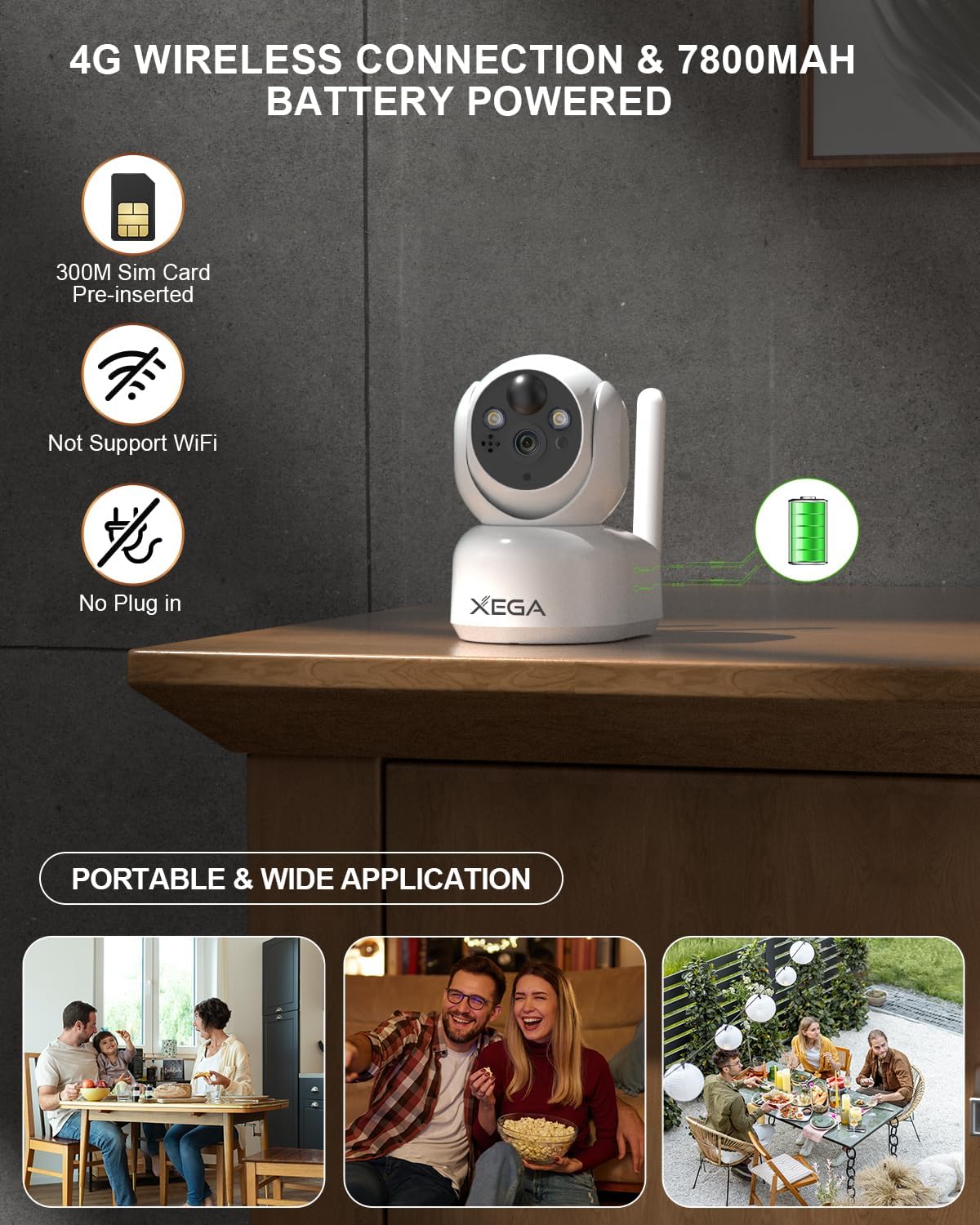 Xega 4G LTE Surveillance Camera Indoor Battery with SIM Card, 2K PTZ 355°/100° Swivel, Without WLAN Camera with 7800 mAh Battery, Colour Night Vision, AI PIR Identification, TF & Cloud Memory, Two-Way