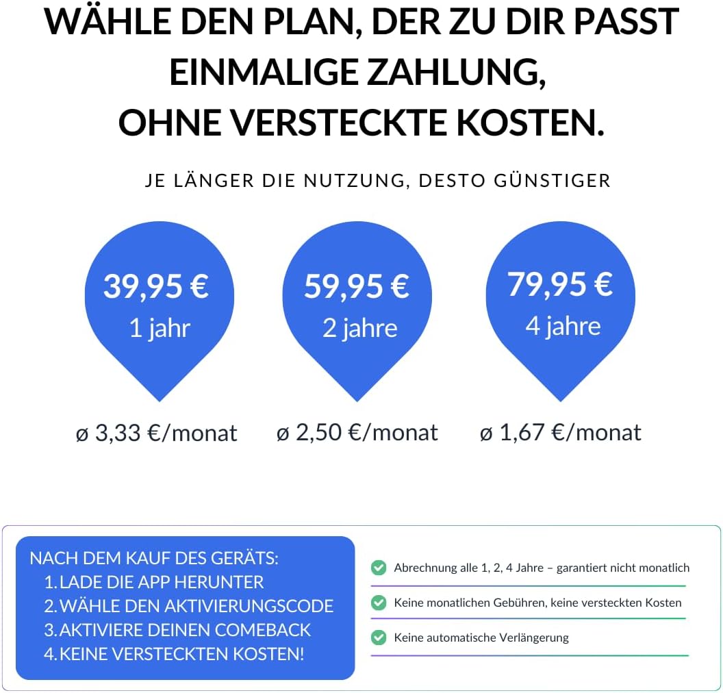 FLEXIBLE & TRANSPARENT PLANT: Activate your tracker for 12, 24 or 48 months (€39.95 / €59.95 / €79.95). No auto-renewal or hidden fees – choose the plan that suits you best and get worry-free tracking. Ready to use and easy activation: with pre-installed 4G SIM for 29 European countries (EU + Switzerland, UK, Norway). Scan QR code on packaging, download app, create account, enter tracker ID & activation code - start live tracking. Real-time tracking: the GPS transmitter for car, motorcycle, camper or truck works via the free Android & iOS app. Receive notifications on movement, speed, geofence alarms and battery status for complete safety and peace. Easy installation: the GPS car tracker is small and attaches securely with the built-in magnet or double-sided tape. Perfect under seats, in the boot or on metal surfaces. Compact and discreet design keeps the tracker hidden. Fleet management: manage multiple car GPS trackers from one account via the web application, share them with family, employees or friends and determine the view for each user. Long battery life: simply charge via the included USB-C cable on any standard USB charger. The large 8000mAh battery provides 2-3 weeks of use or approx. 2,800 km, depending on use. No mtl. Cost: Activation by means of activation code for 1 year: €39.95, 2 years: €59.95, 4 years: €79.95 Ready to go: SIM card already installed in tracker Range: Works in all 4G networks Free app for Android and iOS Live tracking, geo-fence, speed indication, historical routes, standing and parking times, family sharing, virtual fence, web application |