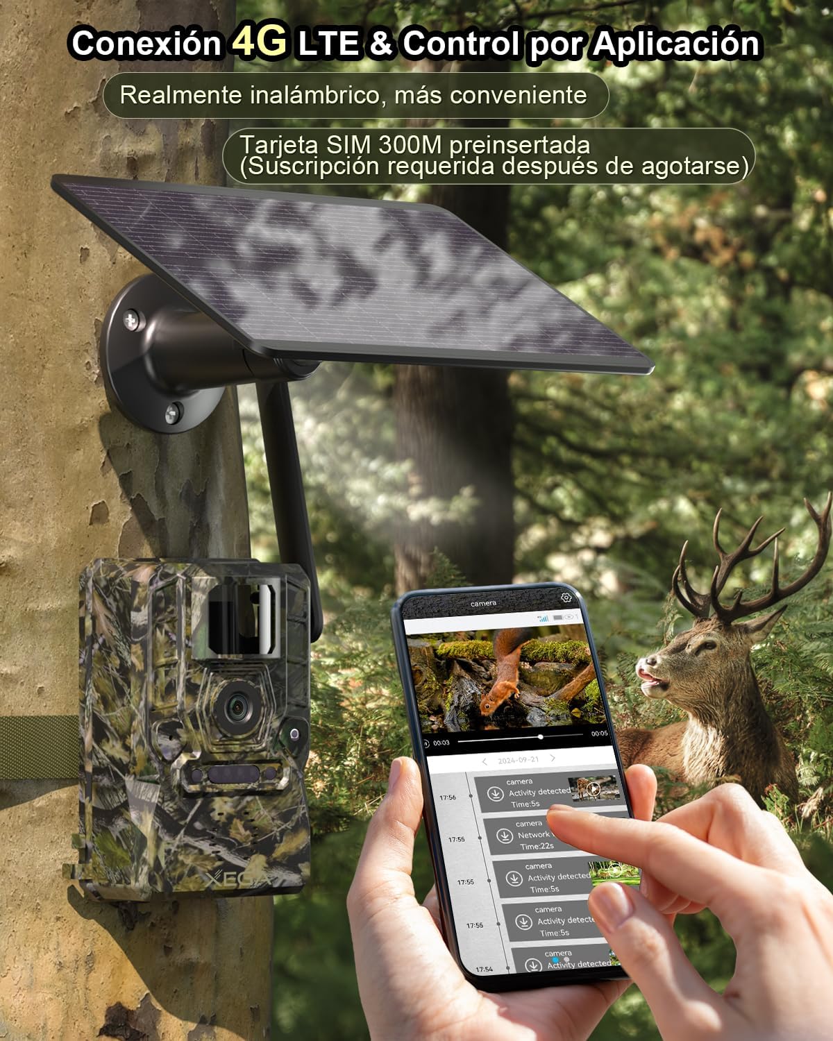Xega 4G Solar Camera with SIM Card 2 Solar Panels, Wireless Outdoor Hunting Phototrap, Motion Detection, Night Vision Without Light, 220° Rotation, App Alerts (WiFi Not Compatible)