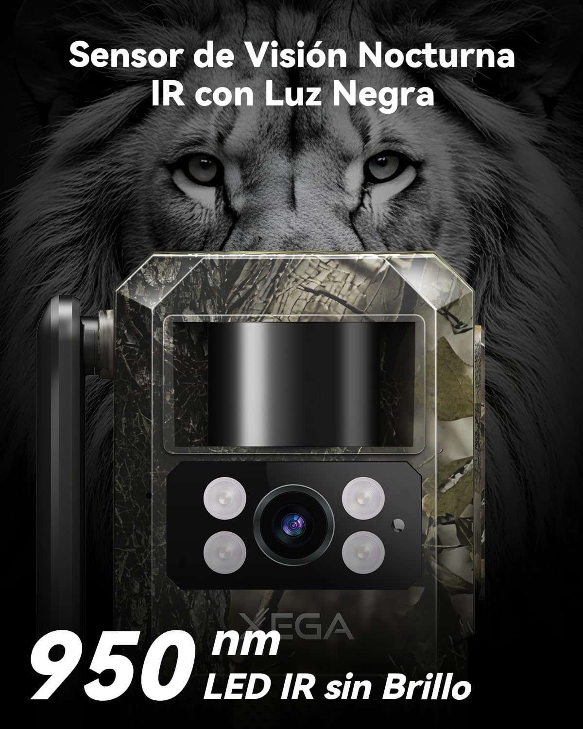 Xega 4G LTE Cámara de Caza Solar con Tarjeta SIM, Cámara Fototrampeo sin WiFi, 7800 mAh Batería, Visión Nocturna 950nm Infrarrojos Invisible, Audio de 2 vías, 0,2s Activación, IP66 Impermeable |