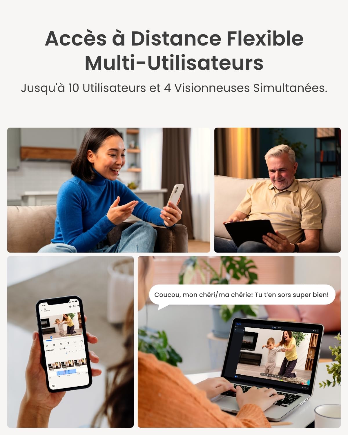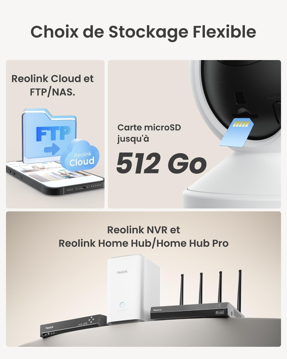 4MP HD & Night Vision: Adopt 4MP clarity and enjoy enhanced infrared night vision for a 30% sharper image; Capture the smallest details, like your baby's breathing or your pet's hair Instant Crying and 2-Way Communication Alerts: Receive instant alerts when crying is detected and communicate with your baby remotely via two-way audio, for greater peace of mind and better connection 360° Coverage & Auto Tracking: With 355° pan function and motion tracking, this camera provides 360° full coverage and tracks movements in real time for total safety, whether it's your baby's crib or your pet's favorite place 4MP HD et Vision Nocturne : Adoptez la clarté des 4MP et bénéficiez d'une vision nocturne infrarouge améliorée pour une image 30 % plus nette. Saisissez les moindres détails, comme la respiration de votre bébé ou les poils de votre animal de compagnie. Alertes de Pleurs Instantanées et Audio Bidirectionnel : Recevez des alertes instantanées en cas de détection de pleurs et communiquez avec votre bébé à distance via la fonction audio bidirectionnelle, pour une plus grande tranquillité d'esprit et une meilleure connexion. Couverture à 360° et Suivi Auto : Avec la fonction Pan à 355° et le Suivi de Mouvement, cette caméra assure une couverture complète à 360° et permet de suivre les mouvements en temps réel pour une sécurité totale, qu'il s'agisse du berceau de votre bébé ou de l'endroit favori de votre animal de compagnie. Plusieurs Options de Stockage Local et en Ligne (Sans Frais Supplémentaires) : Bénéficiez d'options de stockage flexibles et sécurisées sans frais cachés. Que ce soit en utilisant une carte microSD de 512 Go, NVR Reolink ou Reolink Home Hub/Home Hub Pro. Les séquences peuvent également être sauvegardées via Reolink Cloud, FTP ou NAS. Accès facile et tranquillité d'esprit. Gestion Facile + Mode Confidentialité : Gérez facilement votre caméra WiFi intérieure 4MP Reolink avec l'application, sans abonnement requis. Invitez jusqu'à 10 utilisateurs et permettez à 4 personnes de visionner en direct simultanément. Activez le mode Confidentialité pour bloquer la vue de la caméra et couper l'audio (réservé à l’administrateur principal). |