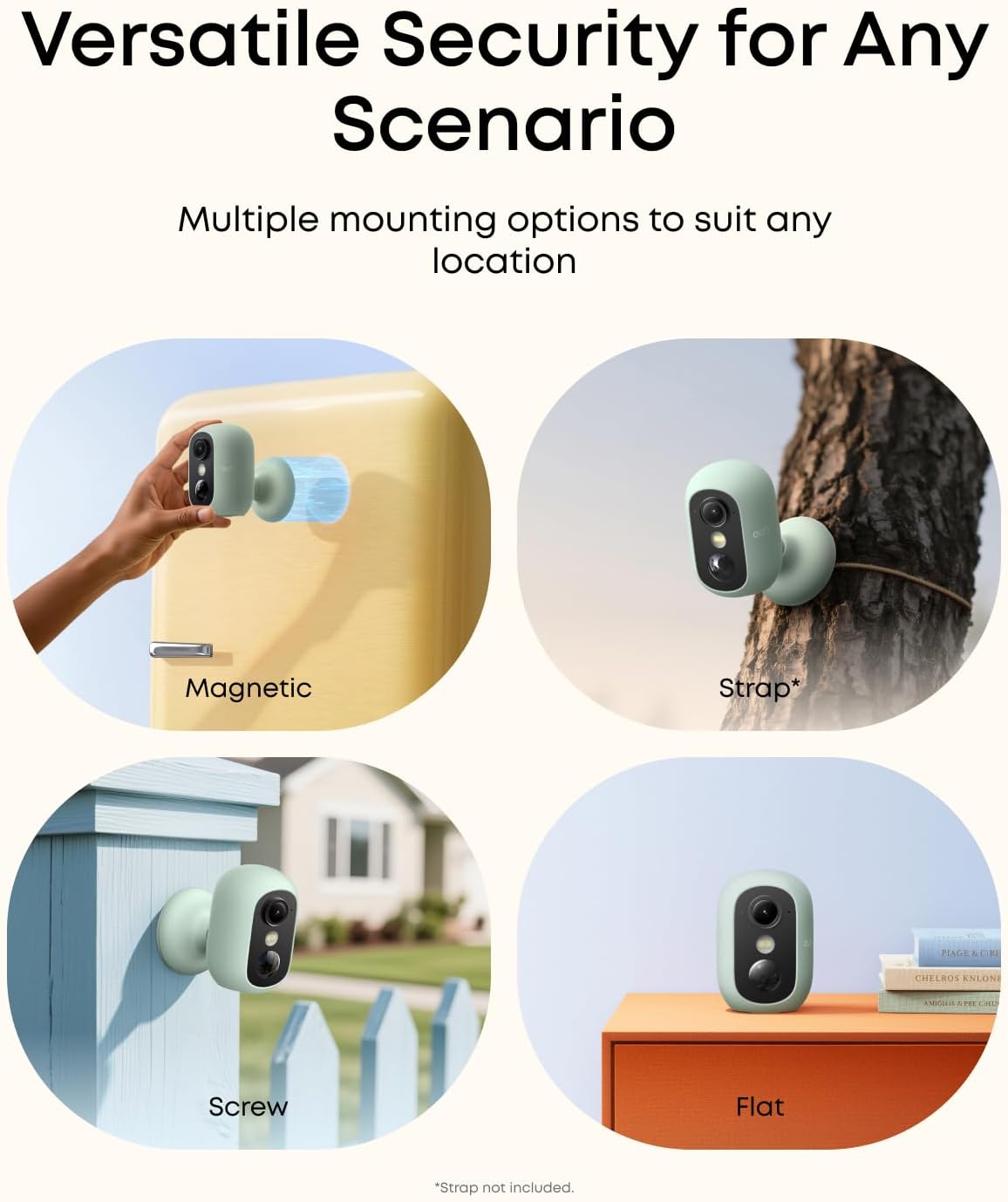 Effortless Security, Anywhere: Easily mount with magnets, rope/string, screws, or simply place on any flat surface to effortlessly install your security camera outdoors or inside. Note: To ensure full functionality, ensure your eufy App is updated to version 5.2.10_16477001 (iOS) or 5.2.10_17014 (Android) or newer. Lifelike Footage, Even at Night: High-quality lens with a larger aperture and upgraded sensor ensures you enjoy vivid, lifelike images in crisp detail. PureColour Vision delivers clear nighttime monitoring in full colour without the need for spotlights or infrared. Subscription-Free Security, On-Device Storage: On-device storage ensures anytime access to all your events via the eufy app. Store footage on HomeBase Mini (up to 1TB with microSD card, not included) or directly on your camera (up to 256GB with microSD card, at least 32GB recommended, not included). Smart Detection with an Instant Response: AI detects people, vehicles, and pets and sends you instant alerts so you always know when something important happens then actively deters threats with sound and light. Set custom activity zones to ensure you only get notifications that are important to you. Stable 2.4 GHz Wi‑Fi Connection: Enjoy reliable transmission and instant alerts with 2.4 GHz Wi‑Fi connectivity for continuous monitoring without signal drops. |