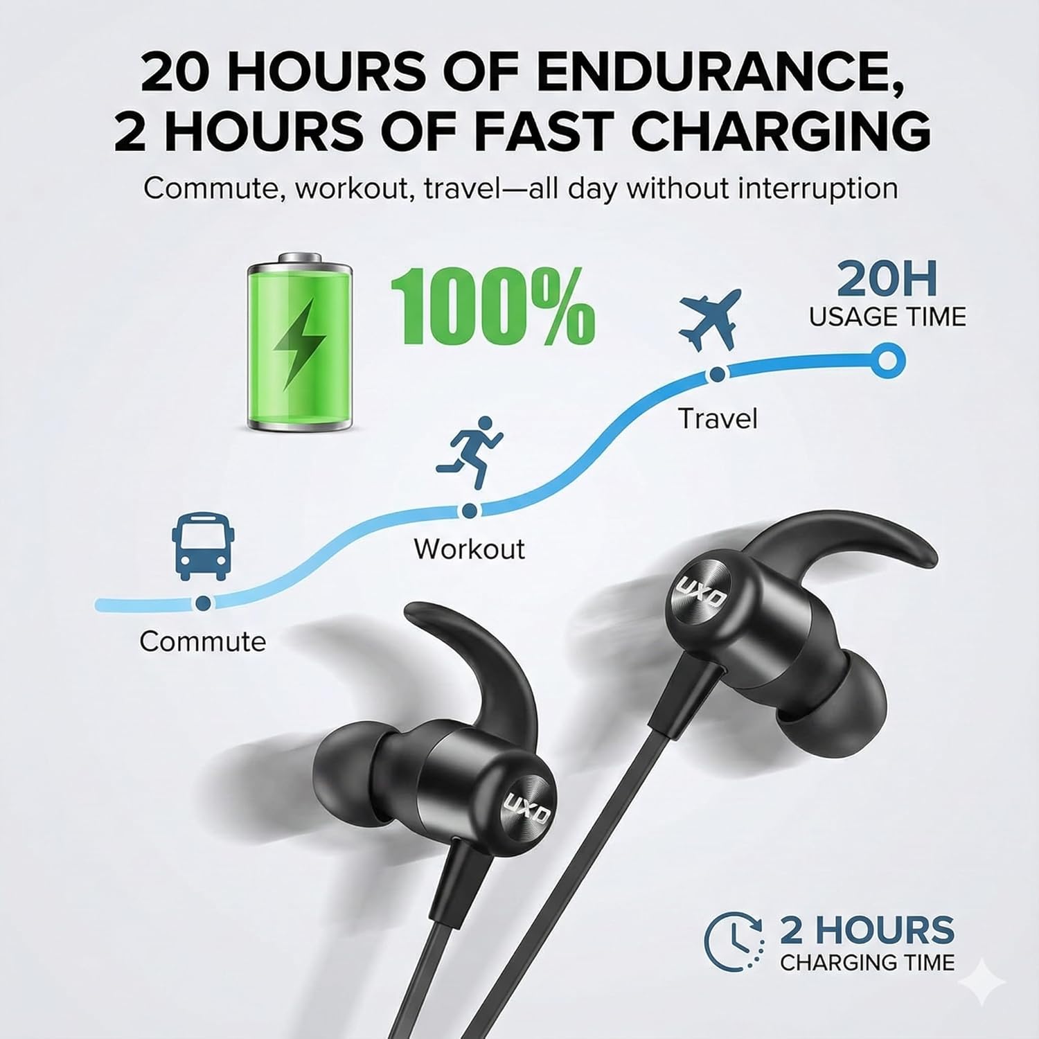 UXD Bluetooth Headphones, Wireless Bluetooth Headphones, Headphones with CVC 8.0 Built-in Microphone, 20 Hours Usage Time, IPX7 Waterproof, Sports Headphones, for Running, Fitness (Black)