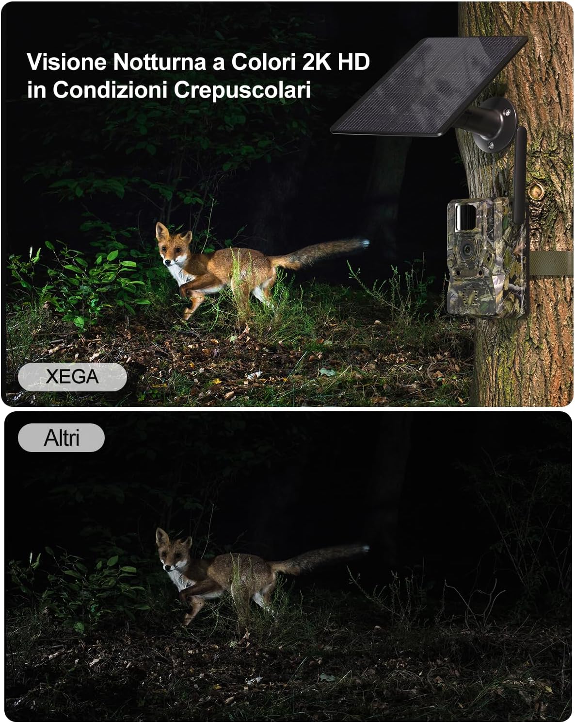 Xega Telecamera Solare 4G con Scheda SIM 2 Pannelli Solari, Fototrappola 4G Senza Fili, Rilevazione Movimento, Visione Notturna Senza Luce, Rotazione 220°, Allerte in Tempo Reale App (Senza WiFi)