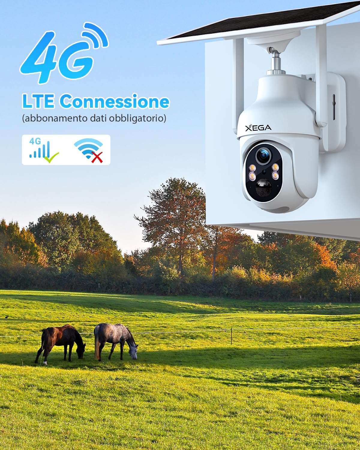 Xega Telecamera con Sim 4G da Esterno, 2K HD PTZ Telecamere Senza Fili con Pannello Solare Batterie 10400mAh, Visione Notturna a Colori, Rilevamento Umano PIR, Audio a 2 Vie, IP66 |