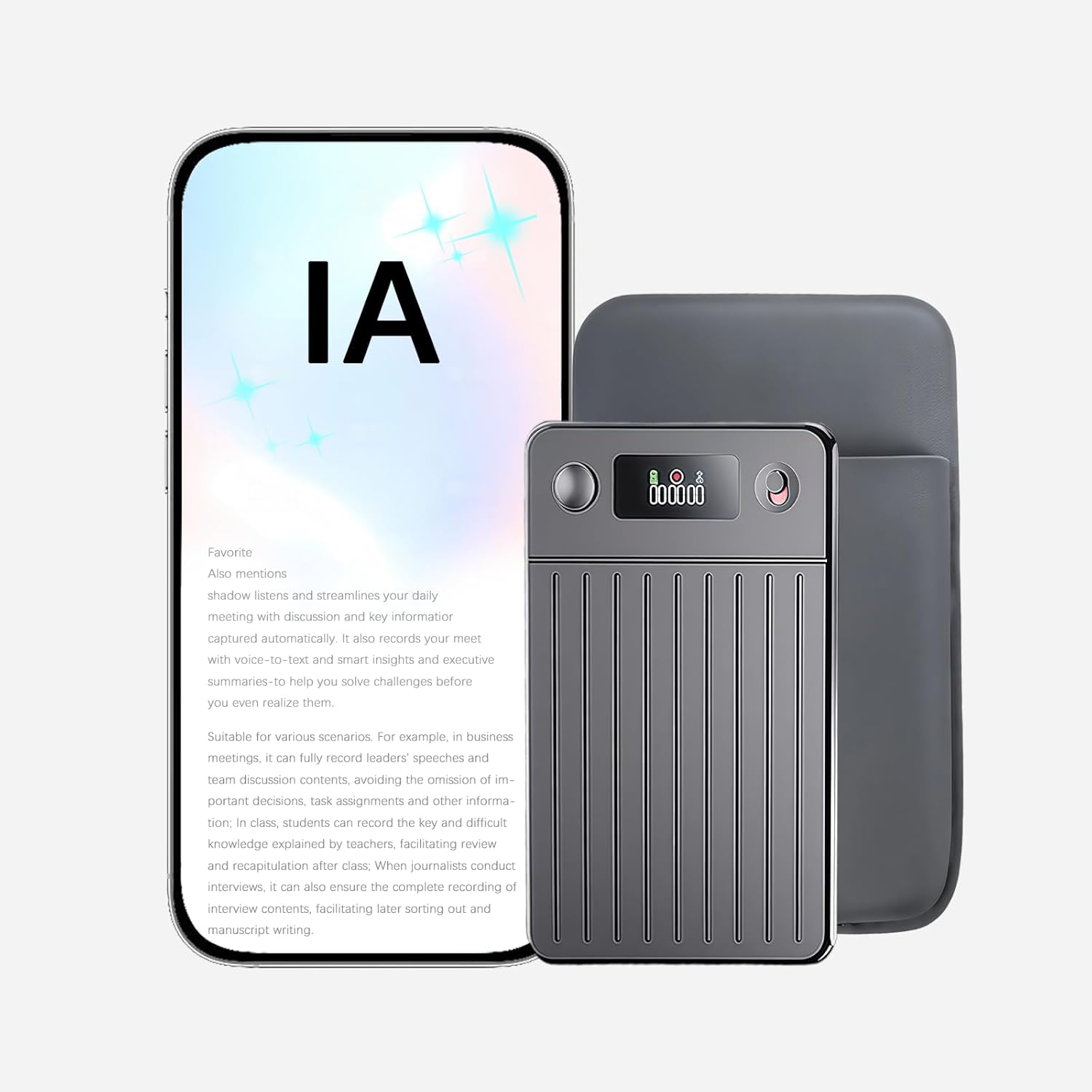 1200 Free Minutes Every Month – Value Included: Get 1200 minutes of free AI transcription and translation every month (equivalent to over 20 hours of manual work). Perfect for lawyers, journalists and managers who want to save time. Total Security and Privacy Guaranteed: Recordings always remain on your device and are password protected. No upload to the cloud, the ideal solution for those who manage confidential information. HD Display for Total Control: 0.42" TFT screen shows battery, memory and real-time recording status. No more lost recordings or handling errors. Crystal clear audio with Dual AI Microphone: Dual microphone + AI DSP technology reduce background noise and capture voice crisply even in noisy environments. 64GB Memory + 28 Hours Battery Life: Store over 500 hours of recordings. Long battery life for meetings, conferences and whole days of classes. Premium Design and Magnetic Charging: Stylish and ultra-thin aluminum alloy case with magnetic charging system. Always ready, easy to carry. CLARITY AND CONTROL AT ALL TIMES: Our voice recorder features a 0.42 inch TFT HD display that allows you to view the real-time battery status, memory space and recording progress. Perfect for those who want total control of their recordings, eliminating management errors. Real-time Transcription & Multilingual Translation: Supporting GPT-5-mini and o3-mini, the device delivers fast, accurate real-time transcriptions andsimultaneous translations in 256 languages. Suitable for conferences, international interviews and multilingual meetings. Plus, you can upload audio files from your smartphone to get instant transcripts and summaries. 1200 minutes of transcription To free every month:Every month, you'll get 1200 free minutes to transcribe, translate and create summaries. Perfect for students, researchers and professionals who need daily help. Dual Microphone and Noise Cancellation With dual microphones with advanced Al noise reduction technology, this recorder ensures crystal clear audio quality even in noisy environments. With 64GB dimemory, you can record over 500 hours of audio, with a battery life of up to 28 hours.making it ideal for long meetings and conferences. Guaranteed data security: Data protection is a priority. With our voice recorder, your recordings are protected by a personal password and are never uploaded to the cloud. An ideal solution for those who need to handle sensitive information. Sturdy Design and Practical Magnetic Charging System:Ultra-thin aluminum alloy case and magnetic charging system bring you aesthetic practicality. An elegant voice recorder that is easy to carry and always ready to use. Instant image translation: With the instant image translation feature, you can take pictures of text or documents and get translated immediately. Perfect for travelers or reading foreign language texts. |