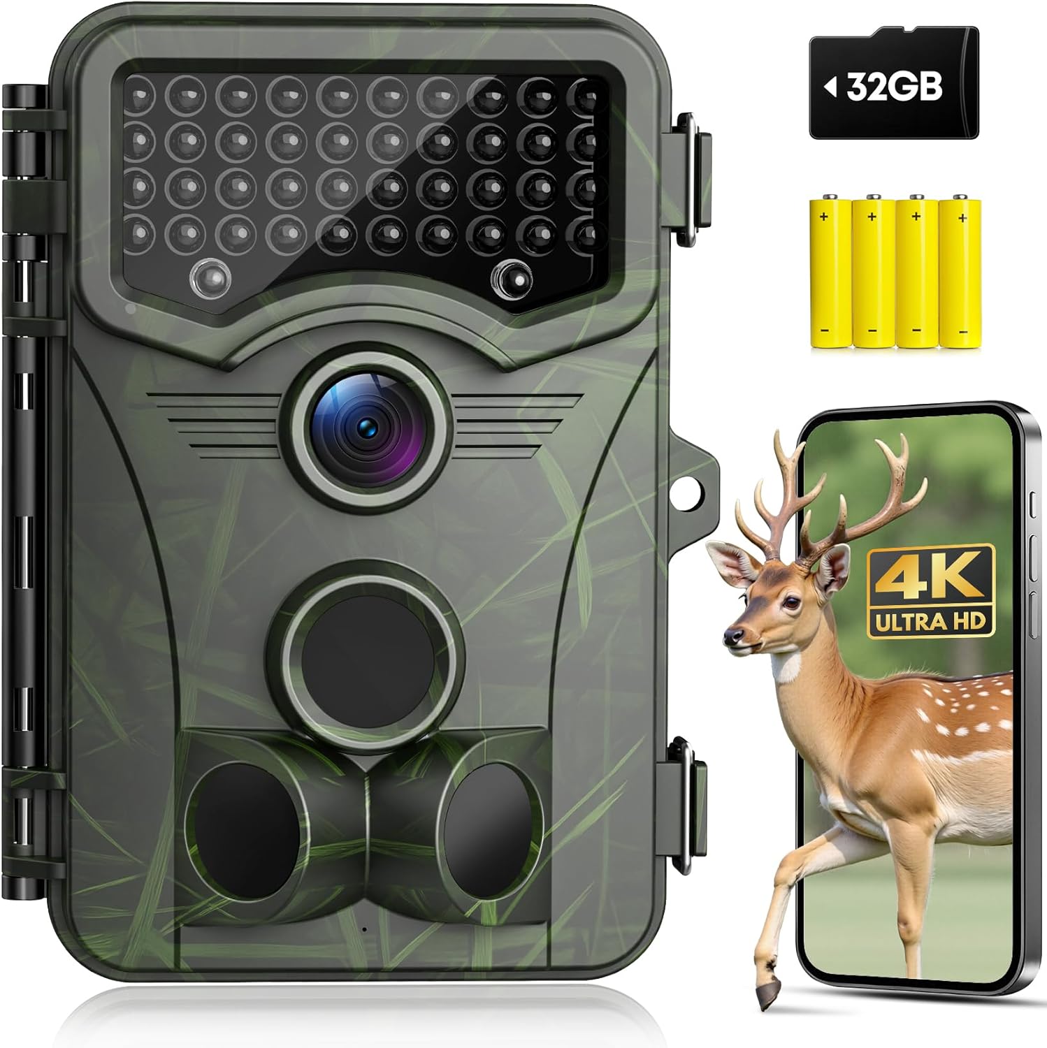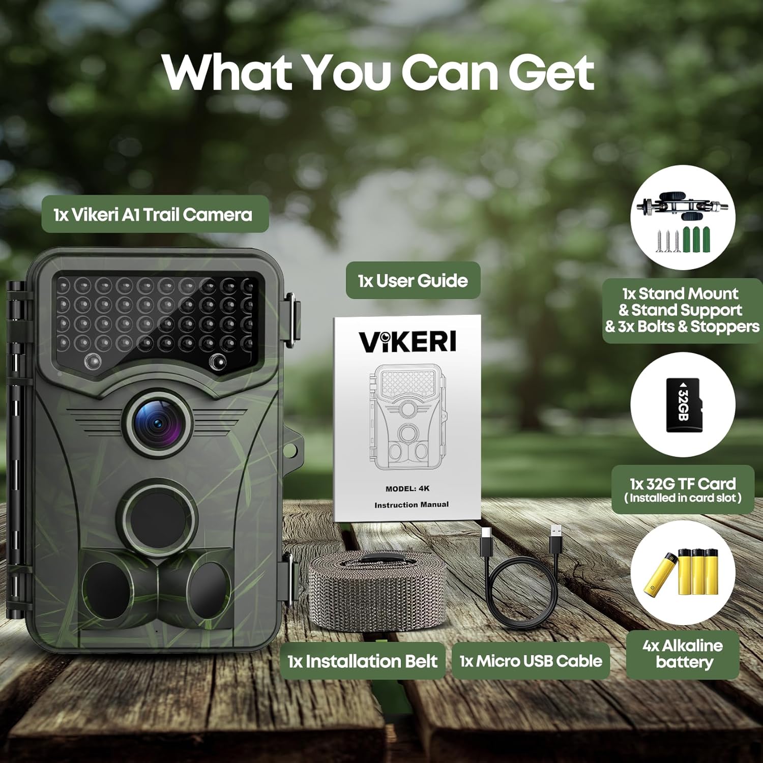 Vikeri 4K 32MP Trail Camera, Game Camera with Night Vision 0.1s Trigger Time Motion Activated 120┬░Wide Lens, IP66 Hunting Camera with 40pcs No Glow Infrared LED 2.4''LCD for Wildlife Monitoring |