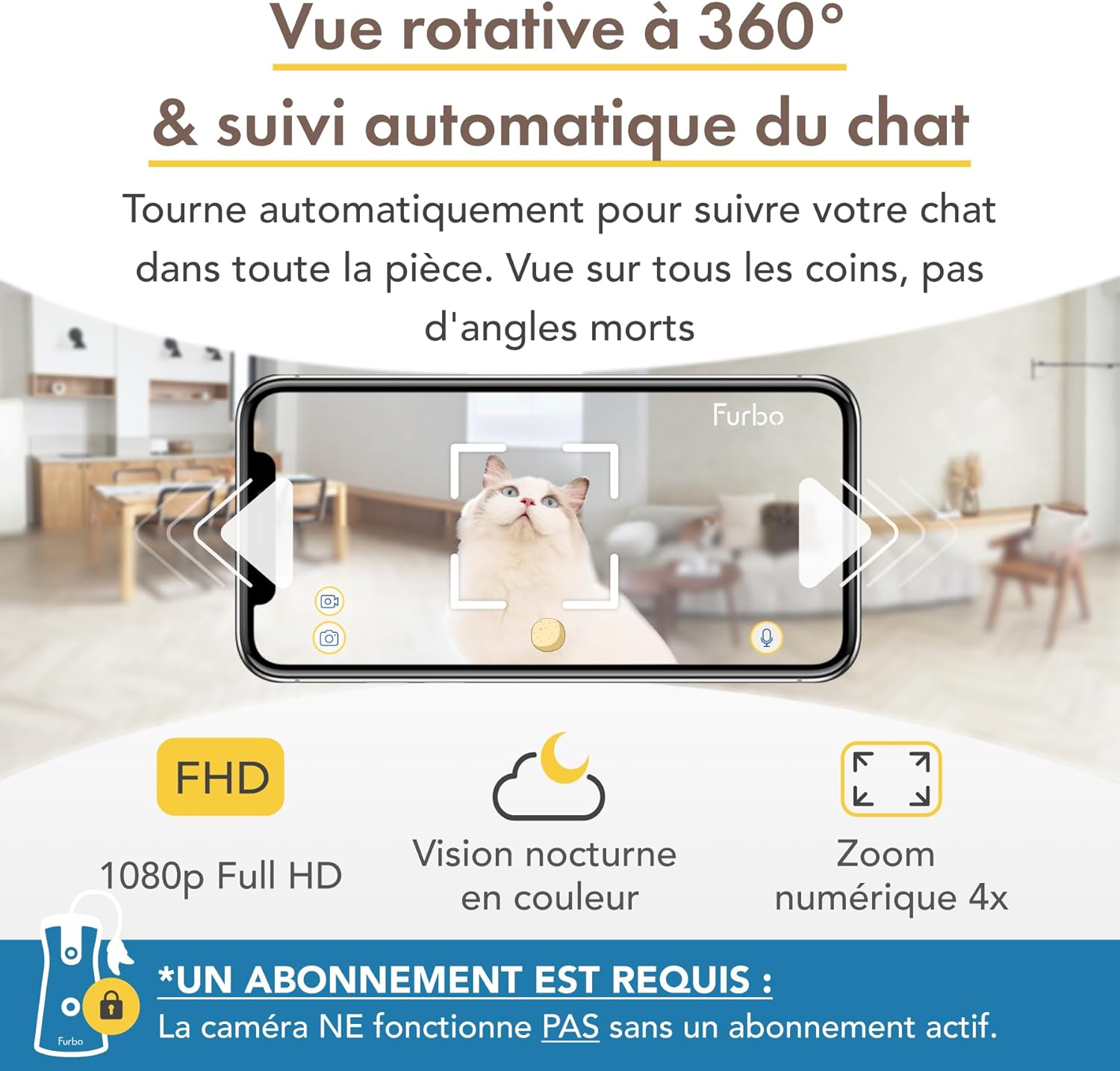 FULL HD CAMERA WITH 360° ROTATING VIEW - The NEW Furbo 360° Cat Camera gives you best-in-class HD video quality with a 360-degree rotating view for full room coverage, day & night. Stunning 1080p live view and high-quality 4x zoom let you easily check on your cat when your away from home.