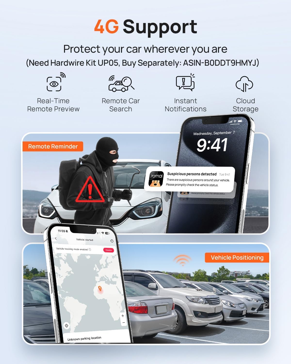 【Dual HDR Super Night Vision】Experience unmatched safety with the dash cam's HDR dual-channel recording, capturing crystal-clear video from both the front and rear cameras. Powered by the STARVIS 2 IMX678 sensor, this dashcam excels in low-light conditions, delivering exceptional night vision. Whether navigating city streets at night or facing tricky lighting, the combination of HDR and IMX678 ensures you capture every detail, providing high-quality evidence for any situation 【Smart App and GPS Tracking】The free APP allows for instant video preview, editing, and downloading, making car camera management effortless. The Bluetooth auxiliary connection ensures faster and simpler access to features. Built-in tri-mode GPS tracks time, date, location, and speed, generating comprehensive driving reports. This data not only enhances your scenic road trips but also serves as strong evidence during accident investigations, protecting you against insurance fraud 【ADAS and Parking Monitor】The Advanced Driver Assistance System (ADAS) provides real-time alerts for front vehicle movement, lane departure, and potential hazards. The 24-hour parking surveillance and AI motion detection ensure your vehicle is monitored even when parked, automatically recording any suspicious activity. Time-lapse recording condenses hours of footage into a quick view, making it easier to review your journeys or any incidents. (Need hardwire kit UP03 or UP05,not included) 【Optional 4G Module (Faster than LTE)】4G Hardwire Kit UP05 (sold separately, ASIN: B0DDT9HMYJ) can be connected to the dash cam for cars remote preview, access, notification and cloud storage. Be the first to know about any unusual activities involving your vehicle and receive alerts. This feature greatly enhances the security of your vehicle, giving you peace of mind whether you are at home or on the road, knowing that your vehicle is protected against theft and constantly monitored 【Loop Recording and Emergency Button】The car dash cam features seamless loop recording, automatically overwriting the oldest footage when the memory card is full, ensuring continuous recording without interruption. (Supports SD cards rated U3, 32GB to 256GB, not included). In addition to the built-in G-sensor, you can also use the dedicated emergency button to lock any footage you deem important. This combination guarantees that crucial moments are always captured and preserved for your review 【Professional Brand Support】70mai is a globally recognized brand known for its commitment to quality and customer service. We prioritize providing you with reliable products and exceptional support, ensuring your driving experience is as safe and secure as possible. Trust in our expertise for your peace of mind on the road 【Easy Setup】Get your front and rear dash camera running in minutes! Our electrostatic sticker technology holds firmly on windshields without sticky residue or suction failures. Set up this front and rear dash camera in <5 minutes—ideal for leased cars or frequent repositioning. 【True 4K Video Quality】Capture every detail in stunning clarity with the 70mai dash cam's true 4K video quality. Equipped with the latest IMX678 sensor and our exclusive MaiColor Vivid+ Solution (MVS), this dual dash cam ensures that your recordings are not only sharp and vibrant but also optimized for exposure balance, color accuracy, and stability. MVS technology enhances your footage in any environment, providing you with high-definition evidence that meets the demands of today’s drivers 【Dual HDR Super Night Vision】Experience unmatched safety with the dash cam's HDR dual-channel recording, capturing crystal-clear video from both the front and rear cameras. Powered by the STARVIS 2 IMX678 sensor, this dashcam excels in low-light conditions, delivering exceptional night vision. Whether navigating city streets at night or facing tricky lighting, the combination of HDR and IMX678 ensures you capture every detail, providing high-quality evidence for any situation 【Smart App and GPS Tracking】The free APP allows for instant video preview, editing, and downloading, making car camera management effortless. The Bluetooth auxiliary connection ensures faster and simpler access to features. Integrated GPS tracks vital information like time, date, location, and speed, enabling comprehensive driving reports. This data not only enhances your scenic road trips but also serves as strong evidence during accident investigations, protecting you against insurance fraud 【ADAS and Parking Monitor】The Advanced Driver Assistance System (ADAS) provides real-time alerts for front vehicle movement, lane departure, and potential hazards. The 24-hour parking surveillance and AI motion detection ensure your vehicle is monitored even when parked, automatically recording any suspicious activity. Time-lapse recording condenses hours of footage into a quick view, making it easier to review your journeys or any incidents. (Need hardwire kit UP03 or UP05,not included) 【Optional 4G Module (Faster than LTE)】4G Hardwire Kit UP05 (sold separately, ASIN: B0DDT9HMYJ) can be connected to the dash cam for cars remote preview, access, notification and cloud storage. Be the first to know about any unusual activities involving your vehicle and receive alerts. This feature greatly enhances the security of your vehicle, giving you peace of mind whether you are at home or on the road, knowing that your vehicle is protected against theft and constantly monitored 【Loop Recording and Emergency Button】The car dash cam features seamless loop recording, automatically overwriting the oldest footage when the memory card is full, ensuring continuous recording without interruption. (Supports SD cards rated U3, 32GB to 256GB, not included). In addition to the built-in G-sensor, you can also use the dedicated emergency button to lock any footage you deem important. This combination guarantees that cr