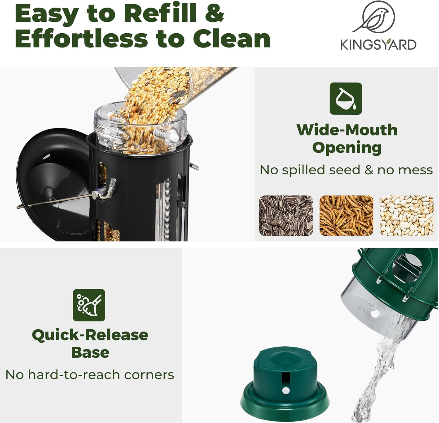 Durable Metal: With its sturdy metal construction and anti-rust powder coating, this feeder withstands a variety of outdoor elements, and even pesky squirrels that love to chew. Great for year-round use Easy to Clean: The removable base provides full access to the bottom, preventing seed residue buildup and clumping. No tools required, simply press the button to quickly release the base for effective cleaning Works with Mix Seed: Holds up to 3 lbs of seeds and suitable for most seed types and blends. The wide-mouth design enables spill-free refilling, while the transparent compartment allows you to monitor seed levels Great Gift Choice: Hang this feeder in your garden or outside kitchen window to attract wild birds like finches, cardinals, chickadees. Enjoy delightful birdwatching every day, making it an ideal gift for parents, children and friends Squirrel-Proof: The weight-activated system detects visitor weight to activate protection mechanism. When a squirrel climbs on, its weight forces the protective shroud downward, blocking all feeding ports Durable Metal: With its sturdy metal construction and anti-rust powder coating, this feeder withstands a variety of outdoor elements, and even pesky squirrels that love to chew. Great for year-round use Easy to Clean: The removable base provides full access to the bottom, preventing seed residue buildup and clumping. No tools required, simply press the button to quickly release the base for effective cleaning Works with Mix Seed: Holds up to 2.5 lbs of seeds and suitable for most seed types and blends. The wide-mouth design enables spill-free refilling, while the transparent compartment allows you to monitor seed levels Great Gift Choice: Hang this feeder in your garden or outside kitchen window to attract wild birds like finches, cardinals, chickadees. Enjoy delightful birdwatching every day, making it an ideal gift for parents, children and friends |