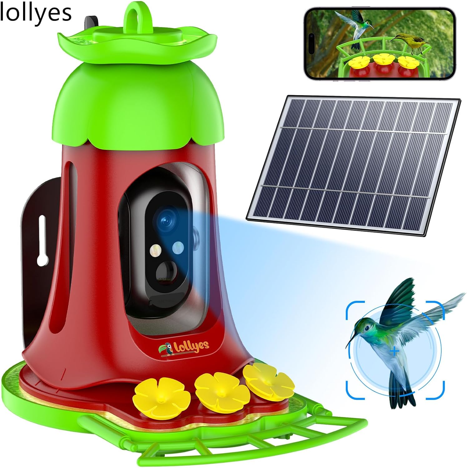 Lollyes Hummingbird Feeder with Camera, 7W Solar-Powered Smart Bird Feeder Camera with SD Card, AI Identify Bird Species, Anti-Ant Moat, Ideal Gift |