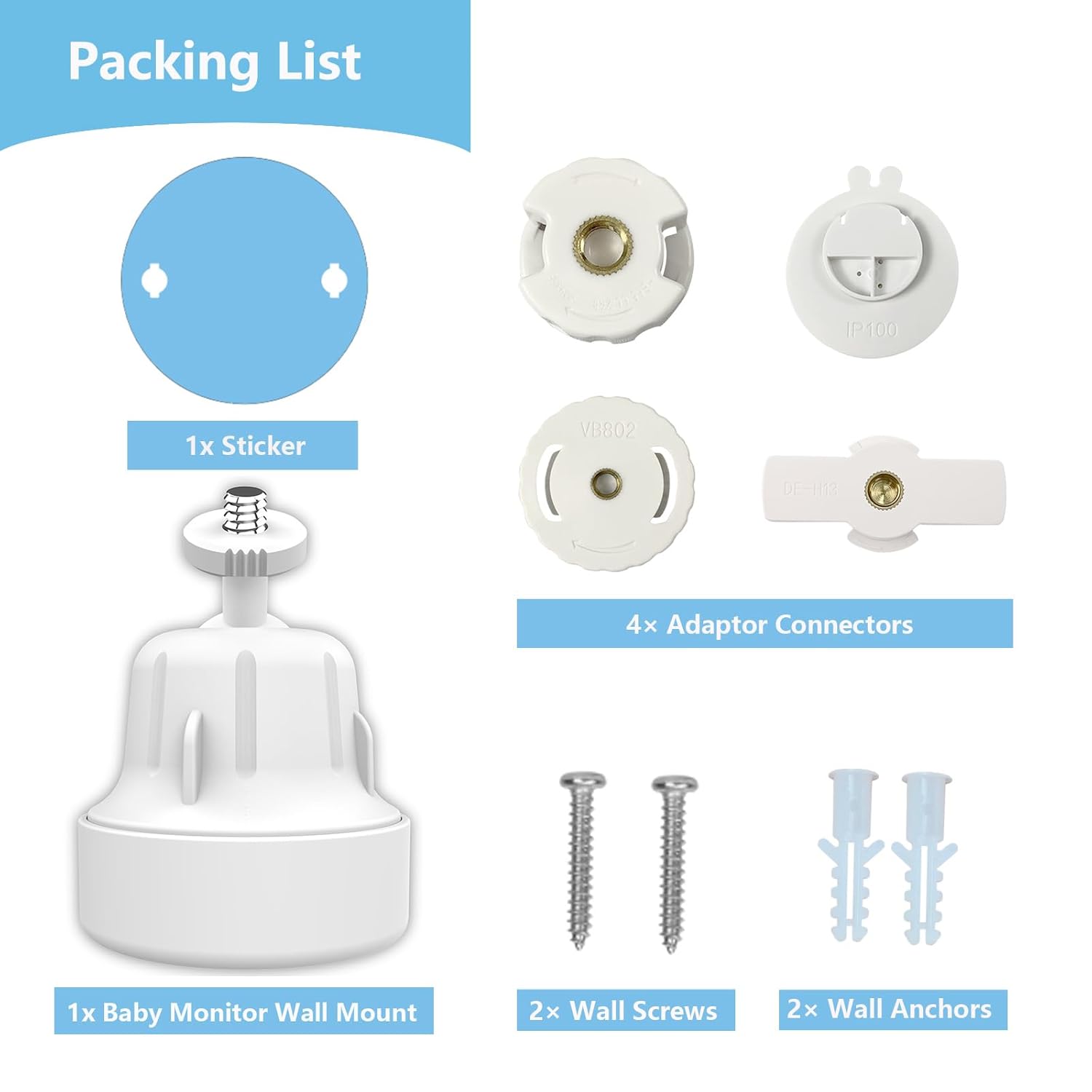 【360-Degree Adjustable Angle】The baby monitor wall mount has a 360-degree adjustable angle, so you can adjust the desired ideal angle to view your baby's field of vision wider 【Easy to Install】It's very easy to install the wall mount for baby monitors. Firstly, stick the sticker on the wall, screw the screw onto the screw position on the sticker, and install the baby camera mount onto the wall. Finally find the appropriate adapter and connect the camera to the baby monitor mount 【Safe and Durable】This baby camera mount is very safe and solid, screws can fix the camera firmly and securely, the baby camera monitor is not easy to fall off 【Package List】1 x Baby Monitor Wall Mount, 4 x Adaptor Connectors, 2 x Wall Screws, 2 x Wall Anchors, 1 x Sticker, 1 x Manual 【Compatibility】Derebir baby monitor mount is compatible with Hellobaby HB6550/ HB6550 Pro/ HB65/ HB66/ HB66 Pro/ HB40/ HB6339/ HB6081, Nooie IPC100, iFamily SM650/SM70A/SM43E/SM653, OKAIDI OD8052/OD8051/OD8060/OD8050, ANMEATE SM935E, Blemil BL9046/BL9052 and fit other baby cameras with standard 1/4 threaded hole.(NOTE: Please check the camera model before placing your order) 【360-Degree Adjustable Angle】The baby monitor wall mount has a 360-degree adjustable angle, so you can adjust the desired ideal angle to view your baby's field of vision wider 【Easy to Install】It's very easy to install the wall mount for baby monitors. Firstly, stick the sticker on the wall, screw the screw onto the screw position on the sticker, and install the baby camera mount onto the wall. Finally find the appropriate adapter and connect the camera to the baby monitor mount 【Safe and Durable】This baby camera mount is very safe and solid, screws can fix the camera firmly and securely, the baby camera monitor is not easy to fall off 【Package List】1 x Baby Monitor Wall Mount, 4 x Adaptor Connectors, 2 x Wall Screws, 2 x Wall Anchors, 1 x Sticker, 1 x Manual |