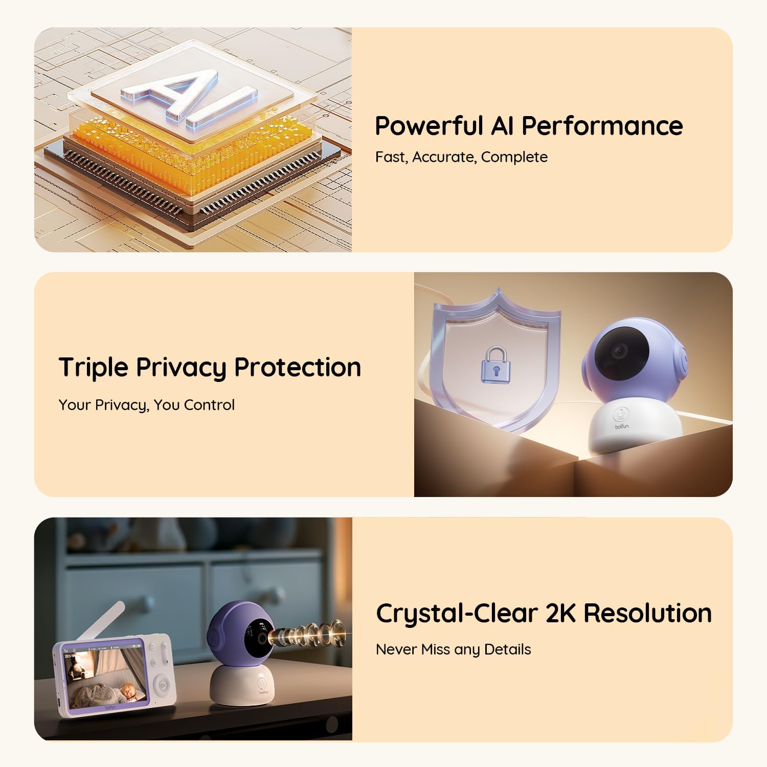 【Dual-Mode Easy Connectivity】BOIFUN Wi-Fi Baby Monitor offers flexible connectivity options for different lifestyle needs. At home, this baby monitor with camera and audio delivers stable, real-time monitoring on a 5-inch screen even without Wi-Fi. When on the go, the Baby Monitor system relies on long-range Wi-Fi (2.4GHz for setup only) to let you check in via phone app. Advanced encryption protects every session, giving working parents and in-home caregivers a private and secure baby monitor with camera and audio experience. 【2K High Definition Camera】This smart video baby monitor with camera and audio captures every tiny detail of your baby day and night for ultra-realistic monitoring. Advanced IR night vision without red light spots lets you clearly see facial expressions, breathing, and sleeping posture without disturbing your baby. The Baby Monitor system also supports video recording, allowing you to replay and save precious moments anytime with your baby monitor with camera and audio. 【360° Coverage with Smart Detection】The BOIFUN Baby Monitor provides 360° coverage with intelligent motion detection and 4x zoom that automatically follows your baby and sends instant alerts to your phone. This baby monitor with camera and audio features a built-in temperature sensor that monitors nursery temperature and notifies you when the room is too hot or too cold, helping you maintain a safe and comfortable environment with a reliable Baby Monitor system. 【All-night Peace of Mind】Designed for overnight care, this baby monitor with camera and audio uses intelligent cry detection to wake the screen when your baby cries, allowing you to monitor your baby without keeping the display on all night. Clear two-way calling and built-in lullabies help you remotely soothe your baby. The parent unit of the Baby Monitor system includes a 3000mAh battery that provides up to 7 days of battery life in VOX mode for reliable, energy-efficient overnight monitoring. 【100% Privacy Protection & Easy Setup】The BOIFUN baby monitor with camera and audio ensures 100% privacy protection with a bank-grade AES128 security chip. Backed by a 2-year warranty and 24/7 support, this Baby Monitor system pairs in two steps for the parent unit and three steps for the app, with video guidance for a fast 2-minute setup. The intuitive interface makes the Baby Monitor easy for new parents and grandparents to use. [ 2K High Definition Video and Full-Room Coverage ] See your baby in stunning 2K clarity, day or night, with the BOIFUN baby monitor. The 3MP camera and wide 110° view ensure every corner is covered, while the 345° horizontal and 65° vertical tilt allows seamless tracking of your baby’s every move. Perfect for keeping an eye on your little one, whether they’re rolling over or exploring the crib. [ Dual Access with App & Screen for Flexibility ] Experience true flexibility with the baby monitor with app and screen. Whether at home with the 5" LCD monitor or on-the-go with your smartphone via the app, you’ll always be connected to your baby. Enjoy real-time monitoring of your baby’s room with or without Wi-Fi, ensuring convenience no matter where you are. [ Smart Detection and Instant Alerts for Your Baby’s Safety ] The Boifun wifi baby monitor for smartphone ensures your baby’s safety with smart motion and sound detection. Receive immediate alerts on both your monitor and smartphone if motion, crying, or noise is detected. Customize your danger zones for extra security, providing proactive and reliable monitoring for your baby’s peace of mind. [ Long Battery Life & Secure Encrypted Storage] Enjoy up to 8 hours of live monitoring and 6 days of standby with the powerful 3000mAh battery of the baby monitor with wifi and screen. Store footage securely on a microSD card (up to 128GB) or cloud with AES128 encryption, ensuring your baby’s safety and your privacy are well protected at all times. [ Comfort and Connect with Lullabies and Two-Way Audio ] Soothing your baby is easy with the Boifun baby monitor with camera and audio. You can sing lullabies, talk, or comfort your baby remotely through the built-in speaker. The baby monitor wifi and app makes staying connected simple, letting you comfort your baby without disturbing their sleep, no matter where you are in the house. [ Track Room Conditions and Feeding Reminders ] Keep your baby’s room in optimal conditions with real-time temperature and humidity monitoring. The baby monitor with camera and wifi alerts you if the room gets too hot or cold. Feeding reminders and multi-user access help everyone stay informed, whether you’re at work or grandma is taking care of your baby. [ 9 Years of Expertise + 2-Year Warranty & 24/7 Support ] Backed by 9 years of experience in baby tech, Boifun baby monitor ensures top-quality and reliable performance. Enjoy peace of mind with a 2-year warranty and 24/7 customer support, so you're never left without assistance when you need it most. |