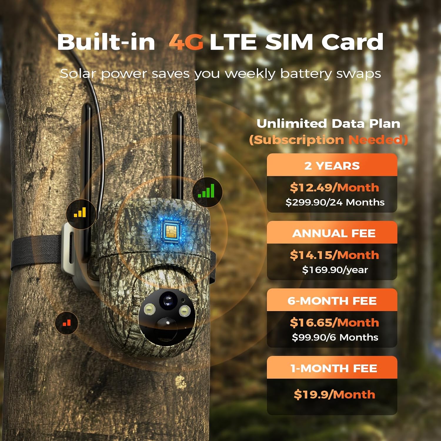 【Built-in SIM Card & 4G LTE Trail Camera】Tkenpro Hunting Camera features a built-in SIM card for superior compatibility. It automatically locks onto the nearest 4G network with the strongest signal, keeping you connected to wildlife observations anytime, anywhere. Enjoy 7 days of unlimited data right after your first activation. Once the trial ends, simply top up for cellular data via the app—plans start at just $19.9 per camera per month or $169.9 annually. (Wi-Fi not supported) 【PIR Motion Detection & 0.2s Trigger Speed】Equipped with the latest PIR motion detection technology, Tkenpro Cellular Game Camera eliminates data waste from trivial false triggers. It captures high-quality videos in a lightning-fast 0.2 seconds and sends instant alerts to your phone the moment motion is detected—so you never miss a critical opportunity. The trail camera also comes with a built-in microphone and speaker, enabling real-time two-way audio. You can even send alerts directly through the mobile app for added convenience 【2K HD Live Streaming & Infrared Night Vision】Immerse yourself in the wild with stunning 2K HD video quality, capturing every tiny detail with exceptional precision. Powered by advanced low-light infrared technology, this game camera offers an impressive 85-foot night vision range. It activates silently at dusk to capture crisp HD nighttime images, ensuring zero disturbance to the wildlife around 【360° Panoramic View & Remote Mobile Access】With the panoramic view function, you can dive into a real-time 360° field of vision. The security camera supports 355° pan and 120° tilt control, letting you effortlessly capture a complete 360° panoramic scene. Boost your observation capabilities with the 4x digital zoom, which lets you zoom in on specific targets with accuracy—ideal for protecting your farm from wild boar intrusions and other threats. Up to 3 users can remotely view via the app at the same time. Experience a new level of clarity, making it easier than ever to monitor activities in natural settings like forests, remote cabins, ranches, and farms 【Solar-Powered & IP65 Weatherproof】This solar cellular game camera is fitted with a high-efficiency 5W solar panel and a 7800mAh rechargeable battery, saving you the hassle of frequent recharging and ensuring non-stop power supply all year round. Even on cloudy days, the cellular trail camera maintains stable monitoring, making it a top choice for outdoor enthusiasts. Boasting an IP65 waterproof rating, it operates reliably in extreme temperatures (-20°C to 50°C), guaranteeing steady performance in areas without Wi-Fi or electricity—such as rainforests and farms 【Built-in SIM Card & Unlimited Data Plan】TKENPRO Trail Cameras have Built-in SIM Cards, which has 300MB of trial data for first time use. Once the trial data runs out, users need to be top up cellular data on app, with plans starting at for $19.9 per month to $169.9 per year per camera (other data plans available, each device requires a separate data plan subscription and cannot be shared). Please note that only the built-in SIM card can be used, as it is non-removable. 【4G LET Cellular Trail Camera】 The 4G LTE Cellular Trail Cameras offers reliable performance with stable signal reception on major networks like Verizon, T-Mobile, and AT&T in 4G LTE areas, ensuring you stay connected in even the most remote locations. Designed without Wi-Fi support, this innovative camera allows for seamless operation in off-the-grid environments, providing instant photo transmission directly to your mobile device. 【Night Vision with 2K Live Streaming】 TKENPRO trail cam equipped with advanced 2K real-time video capabilities combined with night vision technology, this deer camera can be activated silently at night, ensuring that high-definition nighttime images are captured without disturbing wildlife. Ideal for outdoor animal observation, this technology excels in low-light environments, delivering stunning image quality and detail, allowing users to stay informed about their surroundings. 【Motion Activated with 0.2S Fast Speed】Game cameras with night vision motion activated waterproof featuring motion activation technology with an impressive 0.2-second trigger time, this device ensures rapid detection and immediate activation, allowing you to capture important moments without delay. The quick activation not only improves efficiency but also offers peace of mind, knowing that you won’t miss any significant events. 【Memory Card and Cloud Storage 】 This solar trail camera is capable of capturing both images and videos, offering flexible storage options to meet your needs. You can choose to save your media on a memory card (supporting up to 128GB, not included) for convenient local access, or opt for cloud storage, which provides a 30-day trial for new users followed by a subscription for continued access. |
