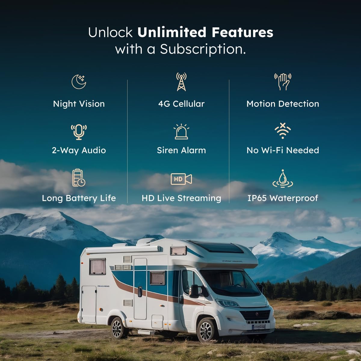 UNLIMITED 4G DATA - TRULY NO LIMITS: Stream and monitor without interruptions. Our unthrottled data plans ensure smooth live video anytime, with flexible options starting at $29.99/month or $199/year. NO WiFi NEEDED, NATIONWIDE 4G COVERAGE : Stay connected on the road or at storage sites with built-in 4G LTE. Monitor your RV anywhere — even in remote campgrounds — without relying on unstable Wi-Fi networks. WIDE HD VIEW WITH 2-WAY TALK: The 300° Pan HD camera captures every corner in sharp detail. Use two-way audio to speak directly — whether it’s scaring off trespassers or checking in with family at the RV. SOLAR-READY & 9000MAH BATTERY: Months of power, or go forever with solar (unlike cams that die in days) - 60 Day Power back up. SMART SECURITY ALERTS: Stay ahead of threats with AI-powered motion detection, alarm & spotlight deterrence, and event-based recording stored securely on SD card. The IP65 weatherproof design and quick magnetic mount make it durable and easy to use anywhere. HUGE BUILT-IN STORAGE: Supports up to 256GB SD cards (most cams only do 128GB) - store weeks of footage without deleting. No sneaky subscription fees on cloud storage (competitors charge monthly). EASY SETUP, NO WIFI NEEDED: Be up and running in minutes while other cams struggle with weak signals. MULTI-CARRIER SIM BUILT-IN: Works on major networks for the best coverage. No hunting for signals like other cellular cams. STICK & GO MAGNETIC MOUNT: Instantly attach to metal surfaces, no screws or static mounts like other cams (Preferably indoors) TOUGH & WEATHERPROOF (IP65): Works in -4°F to 122°F - no babying this cam like other models. UNLIMITED DATA PLANS FOR STREAMING: Unlike other cams, we offer truly unlimited data (no throttling) so you never miss a moment. Affordable plans starting at just $29.99/month or $199/Annual. MULTI-CARRIER SIM BUILT-IN: Works on major networks for the best coverage. No hunting for signals like other cellular cams. HUGE BUILT-IN STORAGE: Supports up to 256GB SD cards (most cams only do 128GB) - store weeks of footage without deleting. No sneaky subscription fees on cloud storage (competitors charge monthly). STICK & GO MAGNETIC MOUNT: Instantly attach to metal surfaces, no screws or static mounts like other cams (Preferably indoors) SOLAR-READY & 9000MAH BATTERY: Months of power, or go forever with solar (unlike cams that die in days) - 60 Day Power back up. TOUGH & WEATHERPROOF (IP65): Works in -4°F to 122°F - no babying this cam like other models. EASY SETUP, NO WIFI NEEDED: Be up and running in minutes while other cams struggle with weak signals. |