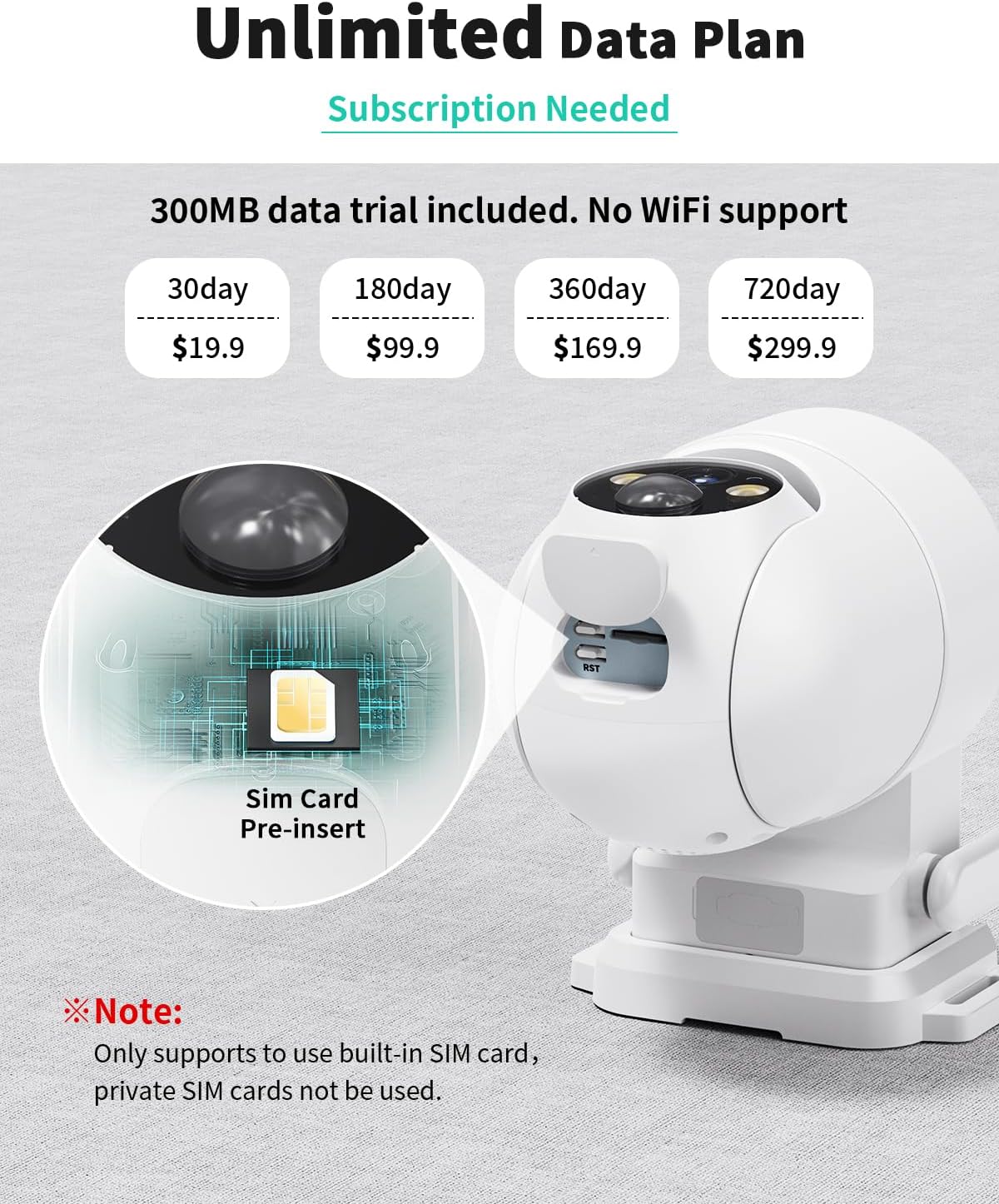 【Built-in SIM Card with Unlimited Data Plan】The no wifi security camera outdoor with a pre-installed SIM card, including 300MB of complimentary data for testing (Note: The SIM card cannot be replaced with a private one). After the trial, subscribe to unlimited data for just $19.90/month or $99.99 for 180 days via UBox. The outside cameras for home support 4G LTE networks(Verizon, T-Mobile, and AT&T). Available in the US only. 【No WiFi or Power Needed】Stay connected anywhere with this 4g lte cellular security camera, perfect for off-grid monitoring in farms, ranches, job sites, cabins, and remote areas. (Note: The outdoor camera wireless doesn't support Wi-Fi Connection) 【Non-Stop Wireless Solar Power】The security cameras wireless outdoor feature a built-in high-capacity battery and solar panel for continuous power—no charging needed! With an IP66 waterproof rating, this solar camera outdoor wireless can withstand any weather and extreme conditions. 【2K HD Color Night Vision and 360° Full View】The solar camera outdoor wireless no wifi feature a spotlight for full-color night vision, ensuring clear images even in complete darkness. Additionally, the PTZ outdoor security camera provides a 355° pan and 100° tilt for a wider, more flexible viewing angle. 【PIR Motion Detection and 2-Way Talk】Equipped with AI-powered human detection, the home security cameras wireless outdoor reduce false alarms and sends instant alerts to your phone. Customize detection zones and schedules to fit your security needs. The two-way talk function allows real-time communication. 【Flexible Local and Cloud Storage】The indoor security camera supports memory card (up to 128GB, not included) and cloud storage (10-second video clips with a free 30-day trial). All videos can be reviewed or downloaded via the UBox App. Check the camera live on your phone and share the feed with family. 【No WiFi or Power Needed】Stay connected anywhere with this 4g lte cellular security camera, perfect for off-grid monitoring in farms, ranches, job sites, cabins, and remote areas. (Note: The outdoor camera wireless doesn't support Wi-Fi Connection) 【Non-Stop Wireless Solar Power】The security cameras wireless outdoor feature a built-in high-capacity battery and solar panel for continuous power—no charging needed! With an IP66 waterproof rating, this solar camera outdoor wireless can withstand any weather and extreme conditions. 【Built-in SIM Card with Unlimited Data Plan】The no wifi security camera camerawith a pre-installed SIM card, including 300MB of complimentary data for testing (Note: The SIM card cannot be replaced with a private one). After the trial, subscribe to unlimited data for just $19.90/month or $99.99 for 180 days via UBox. The outside cameras for home support 4G LTE networks(Verizon, T-Mobile, and AT&T). Available in the US only. 【2K HD Color Night Vision and 360° Full View】The 2K HD solar security camera feature a spotlight for full-color night vision, ensuring clear images even in complete darkness. Additionally, the PTZ outdoor security camera provides a 355° pan and 100° tilt for a wider, more flexible viewing angle. 【PIR Motion Detection and 2-Way Talk】Equipped with AI-powered human detection, the home security cameras wireless outdoor reduce false alarms and sends instant alerts to your phone. Customize detection zones and schedules to fit your security needs. The two-way talk function allows real-time communication. 【Flexible Local and Cloud Storage】The indoor security camera supports memory card (up to 128GB, not included) and cloud storage (10-second video clips with a free 30-day trial). All videos can be reviewed or downloaded via the UBox App. Check the camera live on your phone and share the feed with family. |