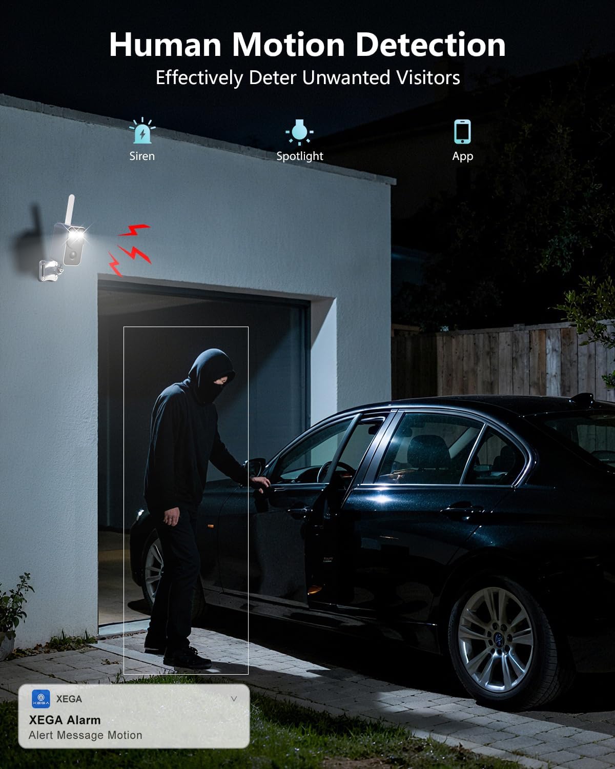 Xega Solar WiFi Camera Outdoor Wireless, 2K PTZ Security Camera with Rechargeable Battery, Color Night Vision, PIR Motion Detection, 2-Way Audio Spotlight & Siren, TF/Cloud Sttorage IP66