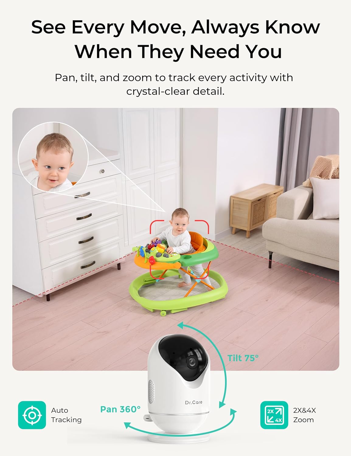 Dr.Care Smart WiFi Baby Monitor - 4” 720P Split Screen & 1080P Camera App Control, Motion Alerts, HD Night Vision, 3000mAh Battery, 2-Way Talk, Multi-User, Triple Security, 1000ft Range |