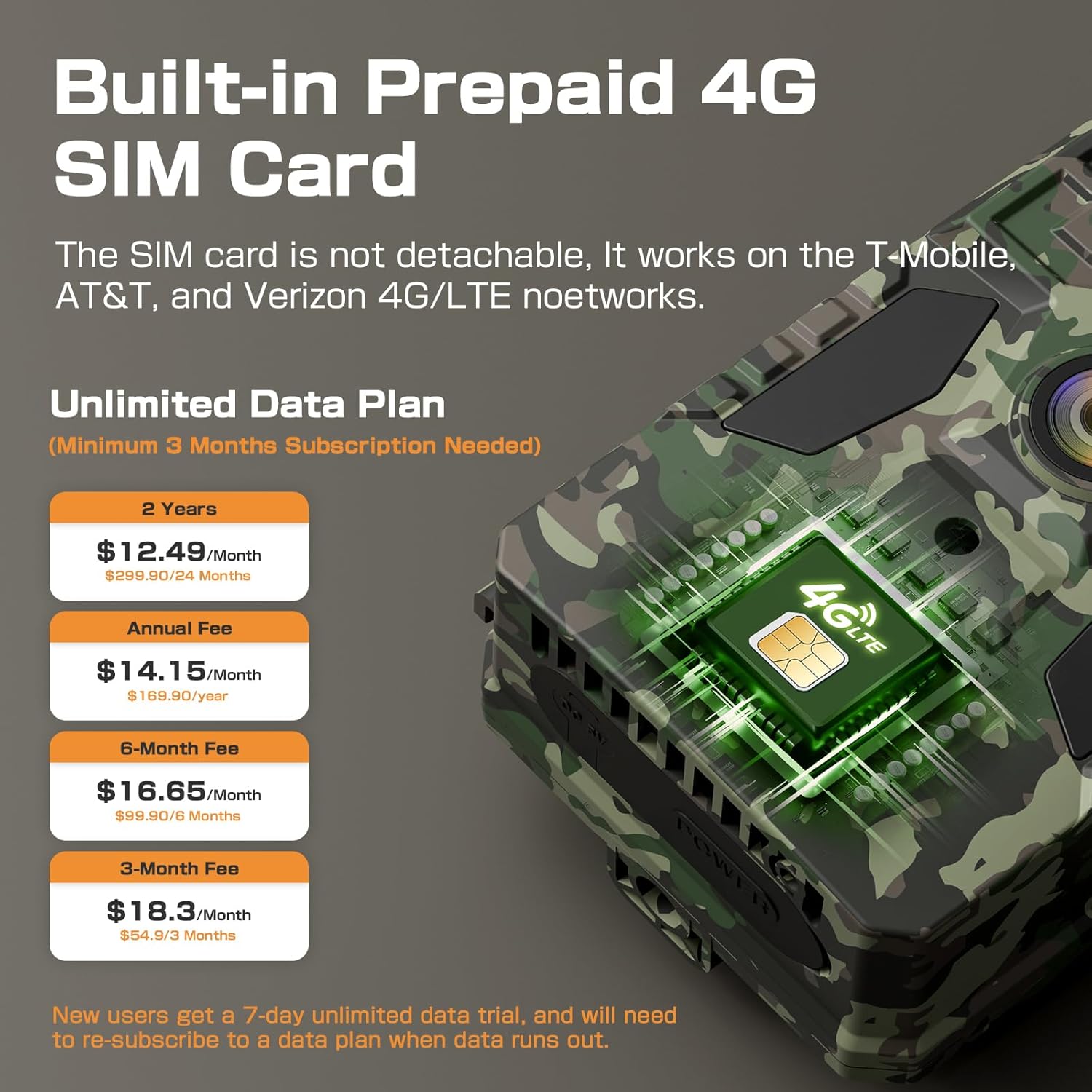 【Built in SIM Card & Unlitimed Data Plan】 The 4G Cellular Trail Camera built-in SIM card can effectively identify the strength of signals from various communication providers(Verizon、T-Mobile and AT&T). New users get a 7-day unlimited data trial, and will need to re-subscribe to a data plan when data runs out. You can renew an unlimited cellular plan for $54.9/ 3 months to $169.9 per year on the app.(Minimum 3 Months subscription period for data plans)Each camera requires a separate data plan subscription and cannot be shared. Note: ONLY the SIM card that comes with the camera can be applied (SIM card is not detachable), and Wi-Fi connection is not supported.