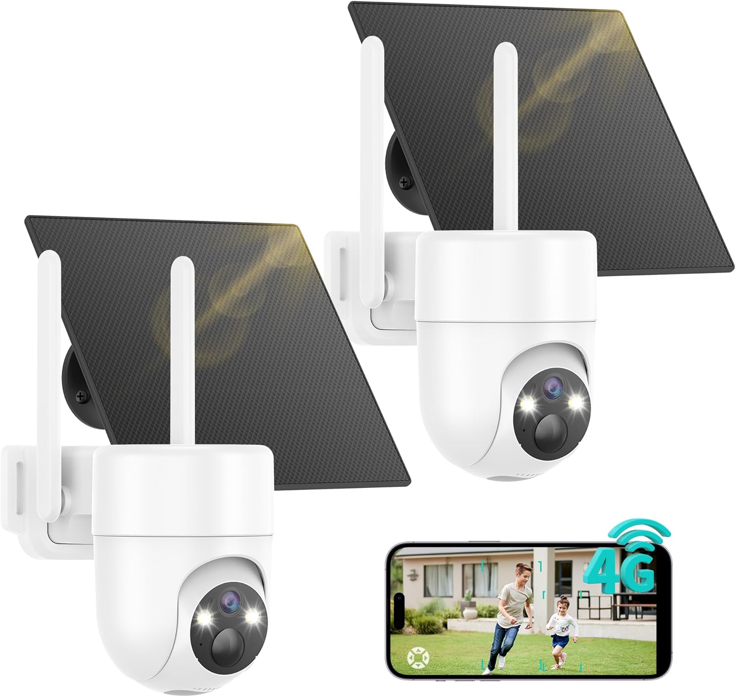 LIWAN 4G LTE Cellular Security Cameras Wireless Outdoor, 2 Pack Solar Cameras No WiFi Needed with SIM Card, 2K Color Night Vision, 360° Live View, PIR Sensor for Off Grid Home Security Surveillance |
