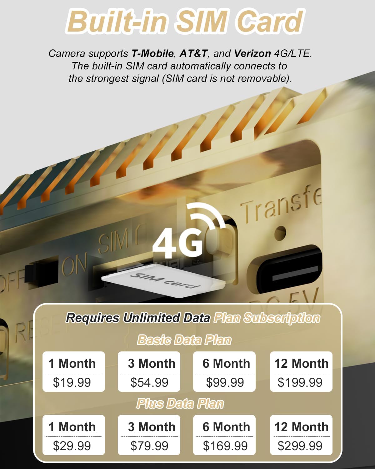 Cellular Trail Camera & Continental US Support Only: With cellular trail camera technology, you can receive photos right to your phone, tablet, or computer through the YesiHome app. Built-in SIM card supports activation of the best network of your choice (supports Verizon, AT&T and T-Mobile) 33MP PHOTOS & 2K Video With Sound: With 33MP photos, you can capture incredible details you never thought possible. When scouting ahead of an important hunting season, details are the key to success. The cellular deer camera has advanced real-time video capabilities to provide you with excellent video quality. The solar-powered trail camera uses 940nm non-luminous infrared night vision, which can start silently at nightfall to capture high-definition night images without disturbing wildlife 4G Unlimited Data Plan Subscription Required: Our trail camera cellular come with a built-in prepaid 4G LTE SIM card, offering a 7-day unlimited data trial for first-time users. Once the trial data runs out, users need to be top up cellular data on app, with plans starting at for $19.99 per month to $199.99 per year per camera (other data plans available, each device requires a separate data plan subscription and cannot be shared) Solar Powered IP65 Waterproof Camera: This solar-powered game camera features a highly efficient 5W solar panel and a 9000mAh rechargeable battery, making it an ideal choice for outdoor enthusiasts, providing continuous power without the need for frequent replacement. With an IP65 waterproof rating, it can withstand harsh weather conditions and ensure reliable operation in areas without Wi-Fi or electricity, such as rain forests and farms 0.3S Trigger Time & PIR Detection Alarm: 0.3S trigger speed, the solar trail camera captures precious moments. This cellular trail camera features an adjustable PIR sensor and a fast 0.3-second trigger speed for precise detection and quick photo and video capture. Users can receive timely alerts through the YesiHome app. Media files can be stored on a memory card-Includes a 32GB SD card (up to 256GB, not included) or in cloud storage (7-day trial available for new users, subscription required thereafter). Users can easily download or play content on their phones Cellular Trail Camera & Continental US Support Only - With cellular trail camera technology, you can receive photos right to your phone, tablet, or computer through the YesiHome app. Built-in SIM card supports activation of the best network of your choice (supports Verizon, AT&T and T-Mobile) 33MP PHOTOS & 1296P Video With Sound - With 33MP photos, you can capture incredible details you never thought possible. When scouting ahead of an important hunting season, details are the key to success. The cellular deer camera has advanced real-time video capabilities to provide you with excellent video quality. The solar-powered trail camera uses 940nm non-luminous infrared night vision, which can start silently at nightfall to capture high-definition night images without disturbing wildlife 4G Unlimited Data Plan Subscription Required - Our trail camera cellular come with a built-in prepaid 4G LTE SIM card, offering a 7-day unlimited data trial for first-time users. Once the trial data runs out, users need to be top up cellular data on app, with plans starting at for $19.99 per month to $199.99 per year per camera (other data plans available, each device requires a separate data plan subscription and cannot be shared) Solar Powered IP65 Waterproof Camera - This solar-powered game camera features a highly efficient 5W solar panel and a 9000mAh rechargeable battery, making it an ideal choice for outdoor enthusiasts, providing continuous power without the need for frequent replacement. With an IP65 waterproof rating, it can withstand harsh weather conditions and ensure reliable operation in areas without Wi-Fi or electricity, such as rain forests and farms 0.3S Trigger Time & PIR Detection Alarm - 0.3S trigger speed, the solar trail camera captures precious moments. This cellular trail camera features an adjustable PIR sensor and a fast 0.3-second trigger speed for precise detection and quick photo and video capture. Users can receive timely alerts through the YesiHome app. Media files can be stored on a memory card-Includes a 32GB SD card (up to 256GB, not included) or in cloud storage (7-day trial available for new users, subscription required thereafter). Users can easily download or play content on their phones |