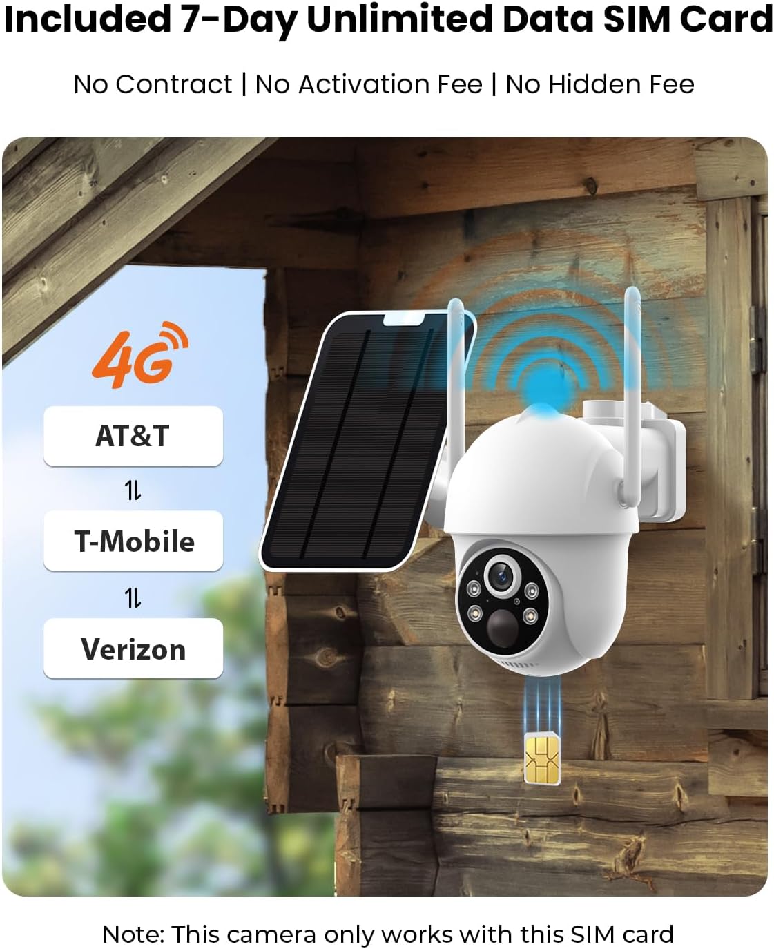 7-Day Unlimited Data SIM Included – This 4G LTE cellular security camera comes with a pre-installed EIOTCLUB SIM card that includes 7-Day unlimited data plan—no contracts. Enjoy real-time monitoring—simply activate the solar camera, and it will automatically connect, giving you long-term, hassle-free security. After the trial ends, you can easily recharge service directly through the EIOTCLUB app